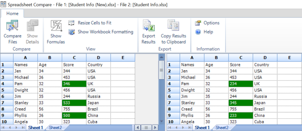 Прокручивая лист, вы увидите, что все ячейки, которые различаются между Sheet1 и Sheet2, отображаются со значениями для каждого листа. Просто прокрутите, чтобы определить все различия.