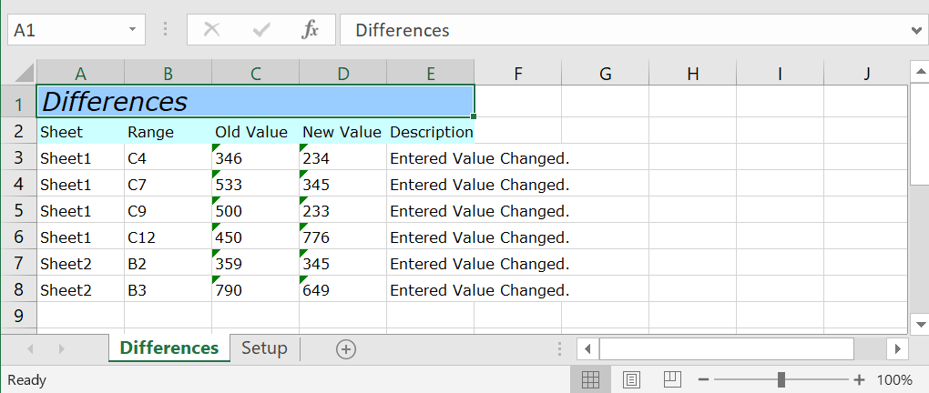 Это запустит сравнение электронных таблиц в новом окне, подчеркнув любое несоответствие в вашем наборе данных. Обычные ячейки с разными значениями будут выделены зеленым цветом. Ячейки с формулами имеют фиолетовый формат, а ячейки с макросом имеют бирюзовую заливку.