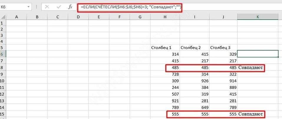 Если столбцов в Эксель более двух, рекомендуется использовать опцию СЧЕТЕСЛИ и ЕСЛИ. При этом сама команда приобретает следующий вид — =ЕСЛИ(СЧЁТЕСЛИ($A2:$C2;$A2)=3;”Совпадают”;” “).