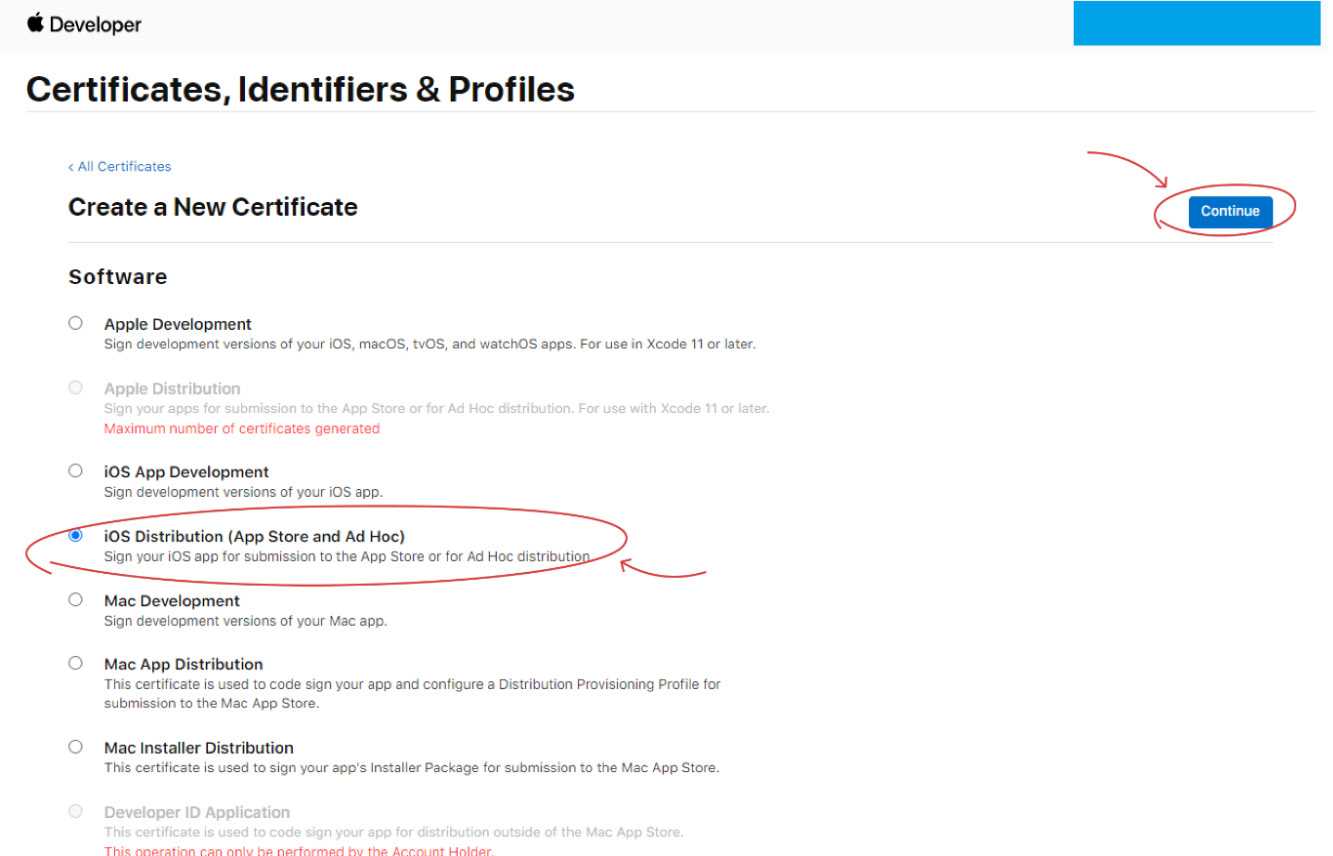 Выбрать тип сертификата App Store and Ad Hoc в разделе “Software” и нажать “Continue” («Продолжить»).