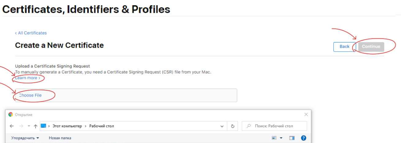 Нажать на “Learn more” («Подробнее») и, следуя приведённым сформировать “Create a certificate signing request”. Затем вернуться на предыдущий шаг и нажать “Choose File”.