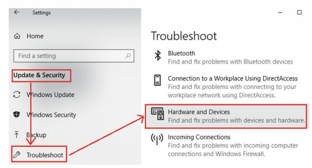- Перейдите к параметру «Устранение неполадок» и нажмите «Оборудование и устройства».