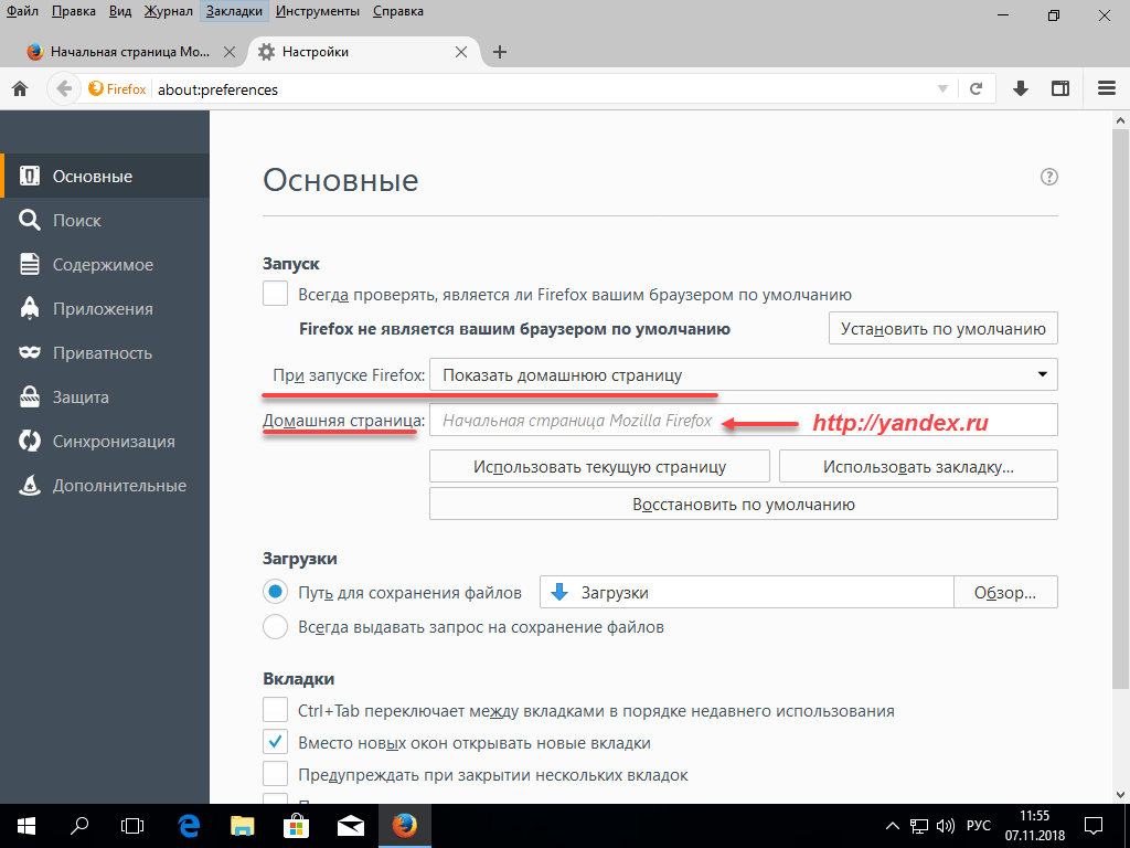 Сразу во вкладке «Основные», указываем, чтобы «При запуске Firefox» показывалась домашняя страница, а в поле ниже указываете уже нужный сайт. В моем случае это Яндекс, который там стоит еще после использования первого метода.