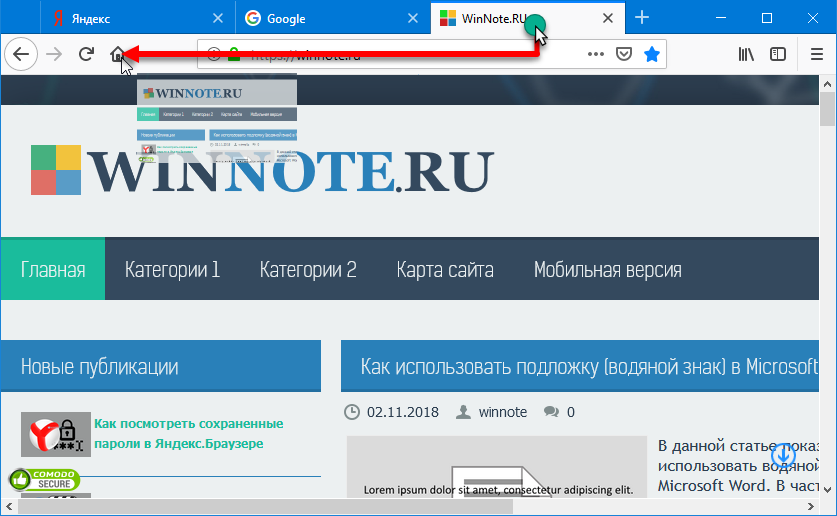 - Откройте сайт, который должен стать стартовым.