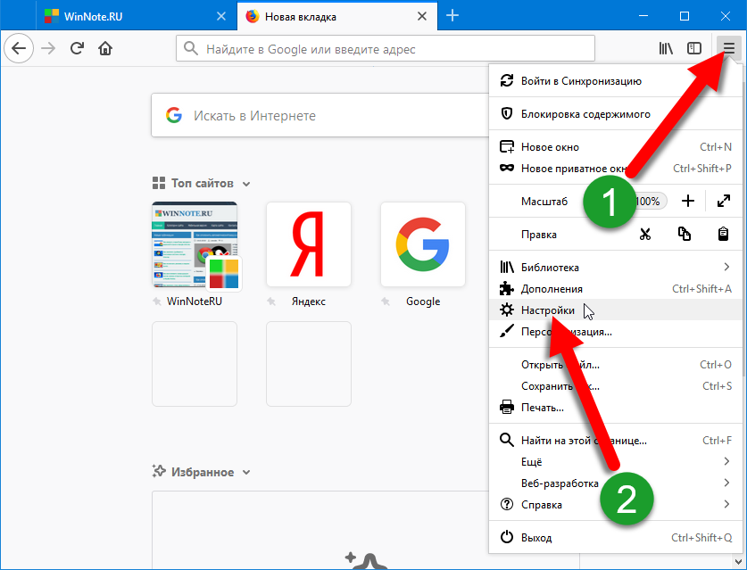 Запускаем Firefox, если он еще не запущен, и переходим в пункт меню «Настройки»