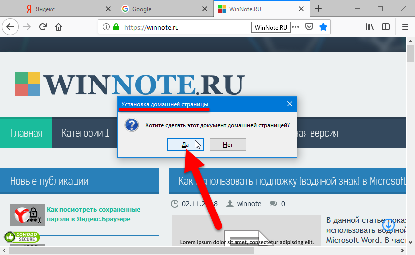 Затем в появившемся окне Установка домашней страницы нажмите кнопку Да .
