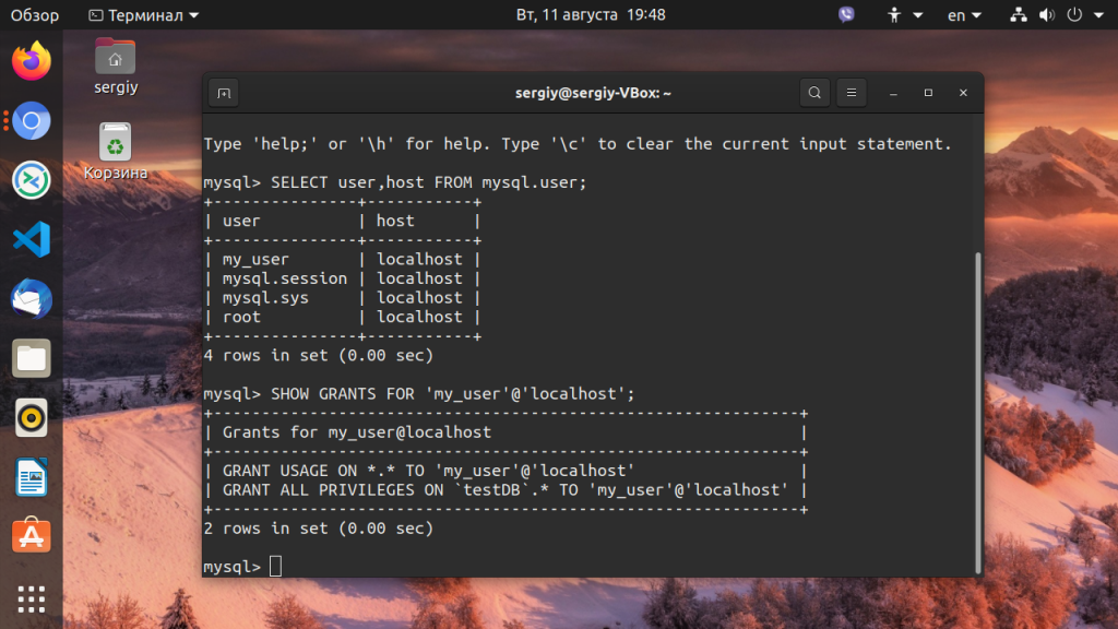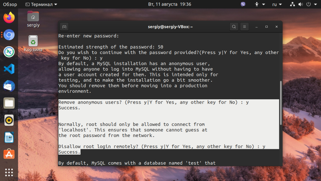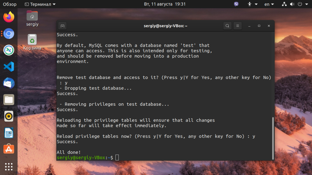 Снова Y, чтобы удалить тестовую базу данных. Затем, обновите привилегии для пользователей: