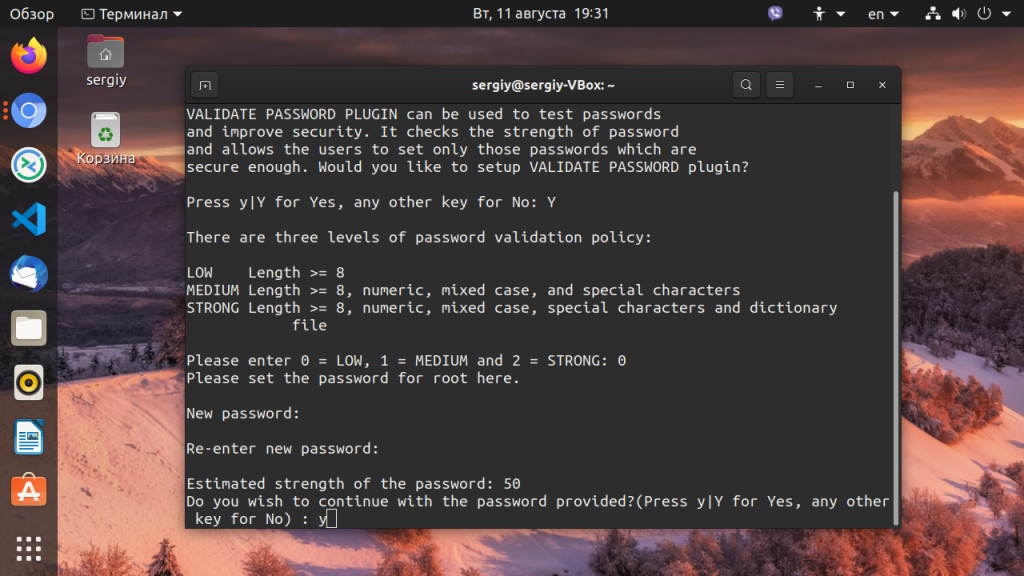 На первом шаге настраивается плагин валидации пароля. Чтобы его включить нажмите Y, или его можно не включать. Затем надо задать сложность пароля, который позволит установить этот плагин. Здесь 0 означает слабый пароль, а 2 — сложный. Когда плагин будет настроен введите пароль root и подтвердите, что хотите использовать именно его: