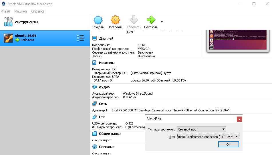 - Поддержка различных видов сетевого взаимодействия (NAT, Host Networking via Bridged, Internal).