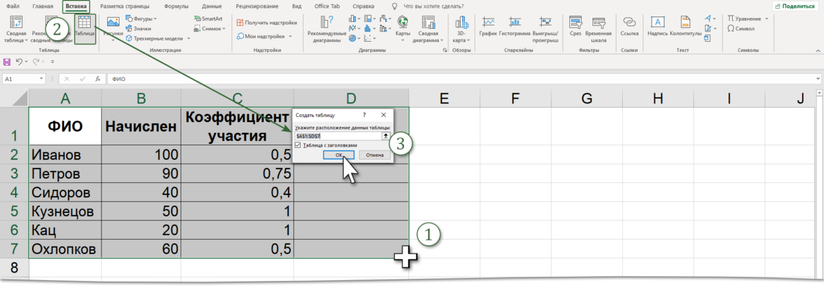 - ОК в диалоговом окне Создать таблицу (то есть подтверждаем указанный диапазон и наличие заголовков в таблице).