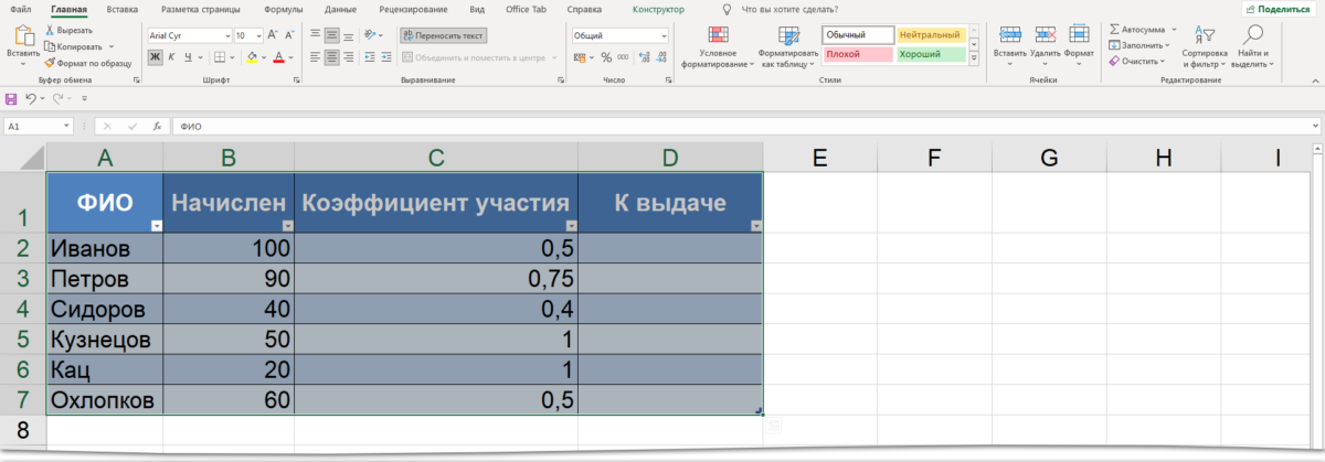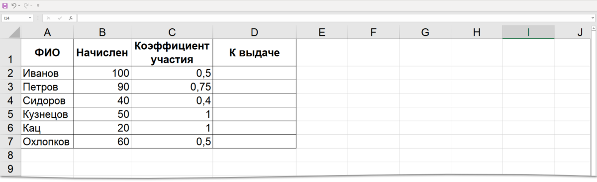 Сотрудникам начислены деньги (я надеюсь на это), и учтен коэффициент участия каждого сотрудника в выполнении какого-то проекта. В диапазоне «К выдаче» должна находиться формула «=Начислен×Коэффициент участия+К выдаче» или «=B1*C1+B1». Формула простая. Такими формулами мы занимались на уроке Excel 9.