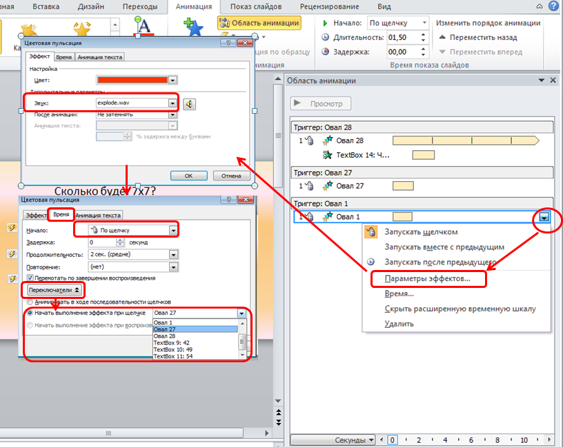 Как это сделано? — Нажмите на текст и выберите для него анимацию. У меня выбрано «Появление». А в параметрах эффектов на вкладке «Время» нажмите «Переключатели» — «начать выполнение эффекта при щелчке» и в выпавшем списке выберите название Вашей зелёной кнопки — у меня это Овал 28.