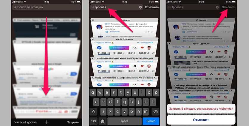 Обратите внимание, что перед закрытием из найденных вкладок можно удалить нужные свайпом, а потом закрыть все оставшиеся. В закладки