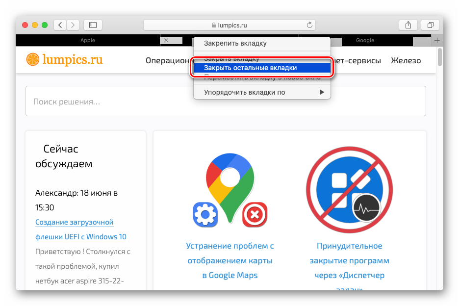 В результате все вкладки закроются в текущем окне браузера оставив лишь одну – ту, которая была выделена. Таким образом, вы перестанете отвлекаться на ненужные вещи и сохраните ресурсы Мас для выполнения важных задач.