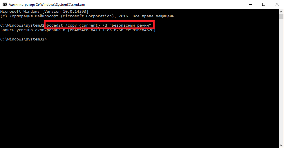 Для начала стоит зайти в командную строку, причем исключительно под администратором. Требуется ввести команду bcdedit /copy /d “Безопасный режим”. Иными словами, запись скопирует уже имеющуюся учетную запись в безопасном режиме. К слову, надпись в кавычках можно переиначить на свое усмотрение.