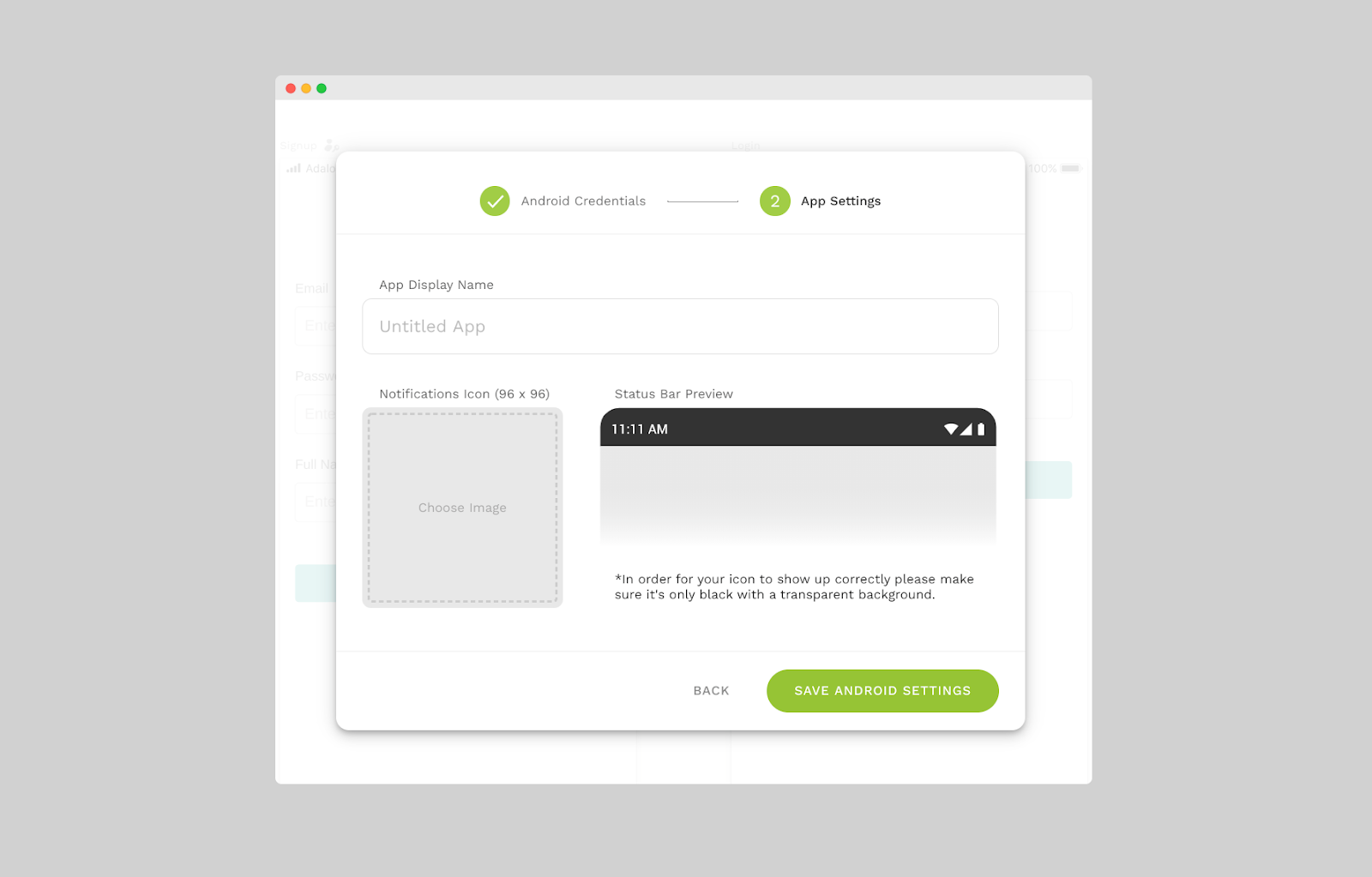5. Настройте свое Android-приложение: введите его название и загрузите иконку, которая будет отображаться в пуш-уведомлениях. Это обязательно, даже если приложение их не отправляет. Затем нажмите кнопку Save Android settings.