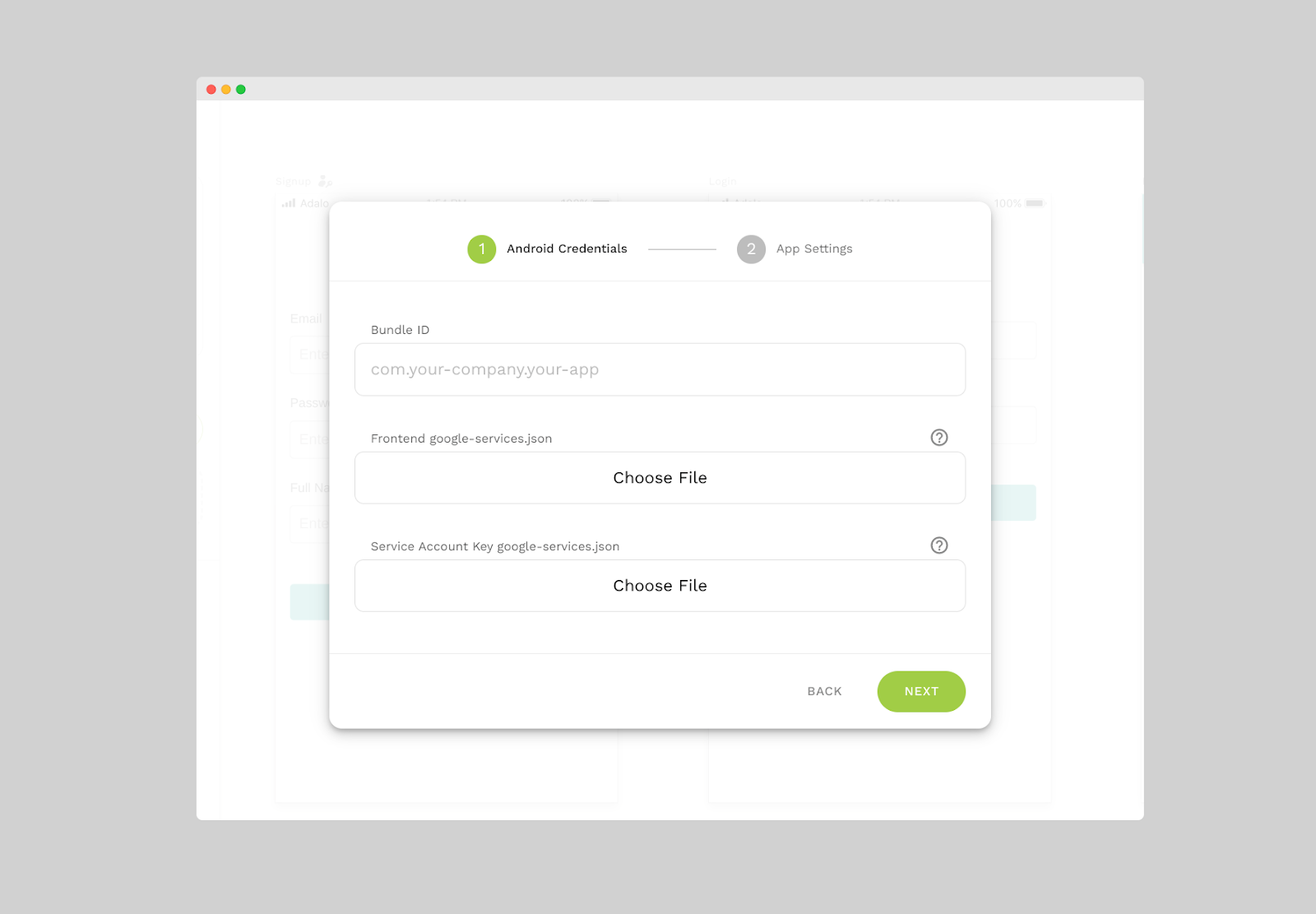 4. Во всплывающем окне введите идентификатор пакета и загрузите файл google-services.json, который скачали в шаге 3. Затем добавьте приватный JSON-ключ, который сгенерировали в шаге 4, и нажмите Next.
