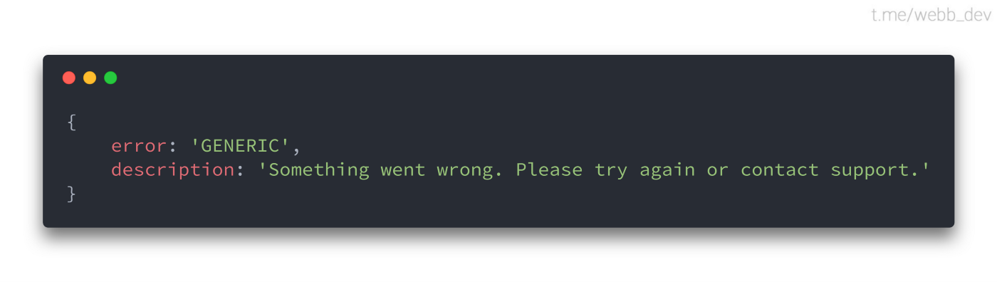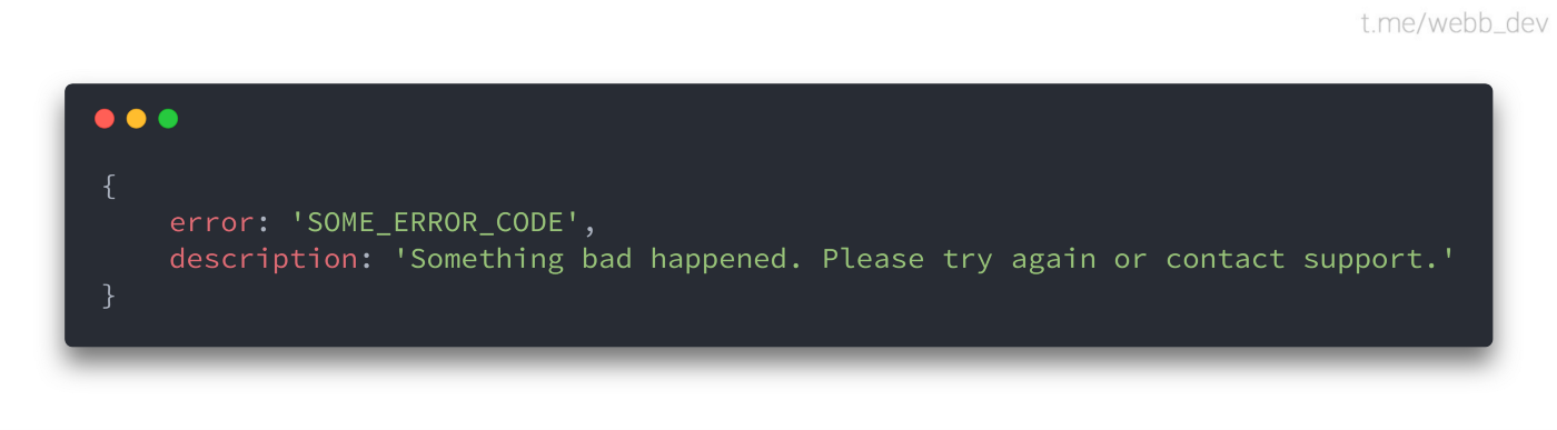 В этих примерах с самими запросами ничего не делается. Тут просто рассматриваются разные сценарии возникновения ошибок. Итак, например, запрос попадёт в функцию , запрос попадёт в функцию и так далее. Эта схема работает и при использовании параметров запросов. Например — для запроса вида . В целом, здесь продемонстрировано, что при обработке ошибок, во фронтенд может попасть либо общая ошибка, содержащая лишь предложение попробовать снова или связаться с владельцем сервера, либо ошибка, сформированная с использованием конструктора , которая содержит подробные сведения о проблеме.Данные общей ошибки придут в клиентскую часть приложения в таком виде: