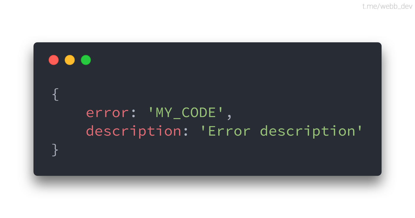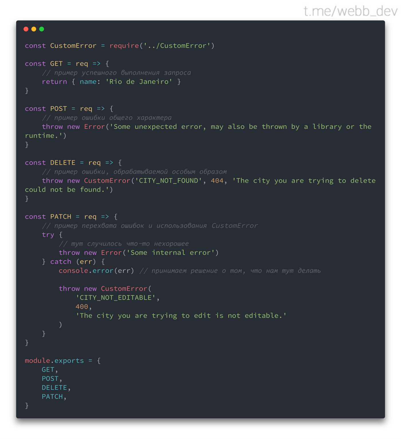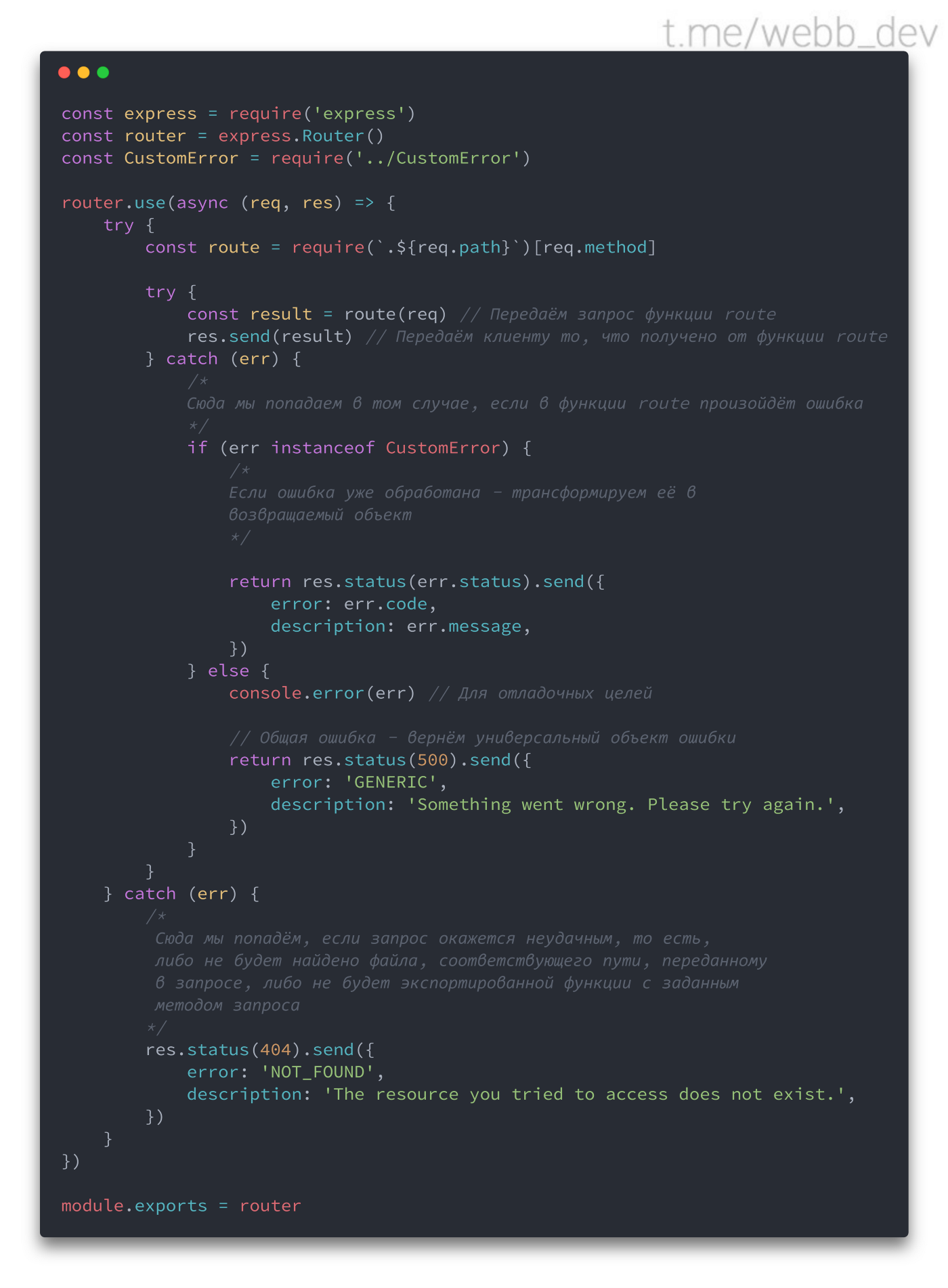 Для того чтобы справиться с этой проблемой, мы можем реализовать собственный обработчик маршрутов и определять логику маршрутов в виде обычных функций. Благодаря такому подходу, если функция маршрута (или любая другая функция) выбрасывает ошибку, она попадёт в обработчик маршрутов, который затем может передать её клиентской части приложения. При возникновении ошибки на сервере мы планируем передавать её во фронтенд в следующем формате, полагая, что для этого будет применяться JSON-API: