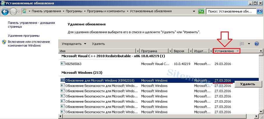 Войдите в панель управления через меню Пуск >> Программы и компоненты >> Просмотр установленных обновлений. Кликните по столбцу «Установлено» для сортировки по дате и удаляйте строки по одной до тех пор, пока ошибка 80070002 не пропадёт.