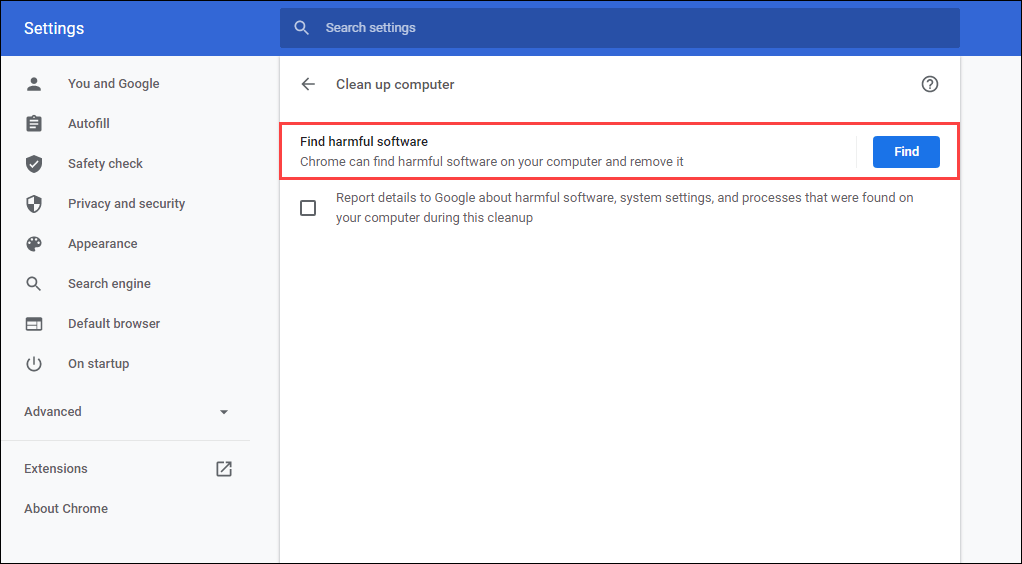 Если вы используете Chrome в Windows, вы также можете использовать его встроенный инструмент удаления вредоносных программ для удаления вредоносных расширений и угонщиков браузера. Чтобы запустить его, откройте меню Chrome и выберите «Настройки»> «Дополнительно»> «Сброс и очистка»> «Очистить компьютер»> «Найти».
