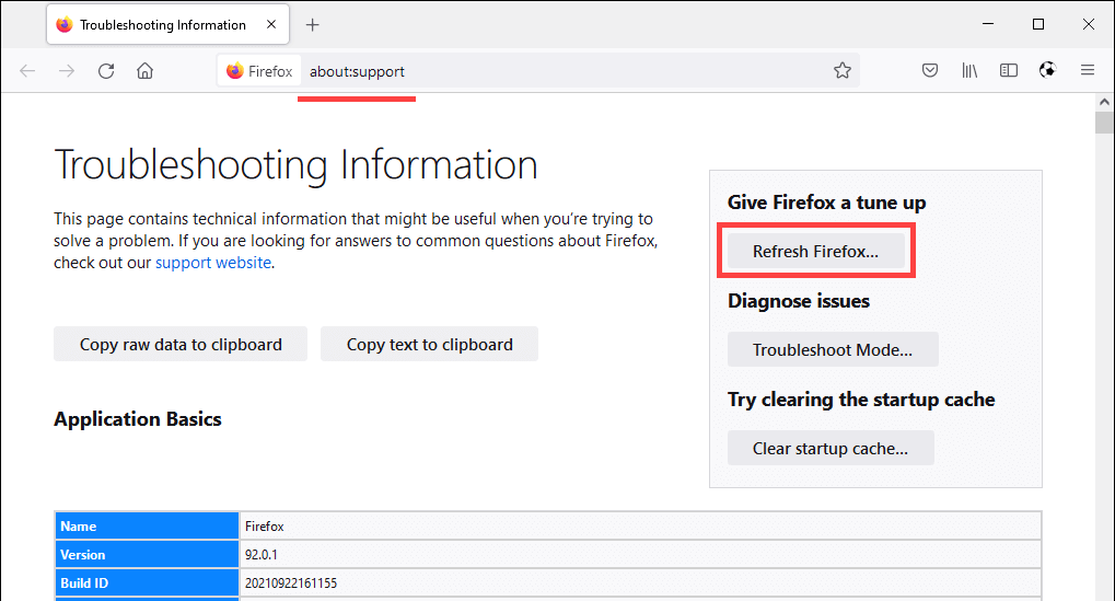 Введите about: support на новой вкладке Firefox и нажмите Enter. Затем выберите «Обновить Firefox».