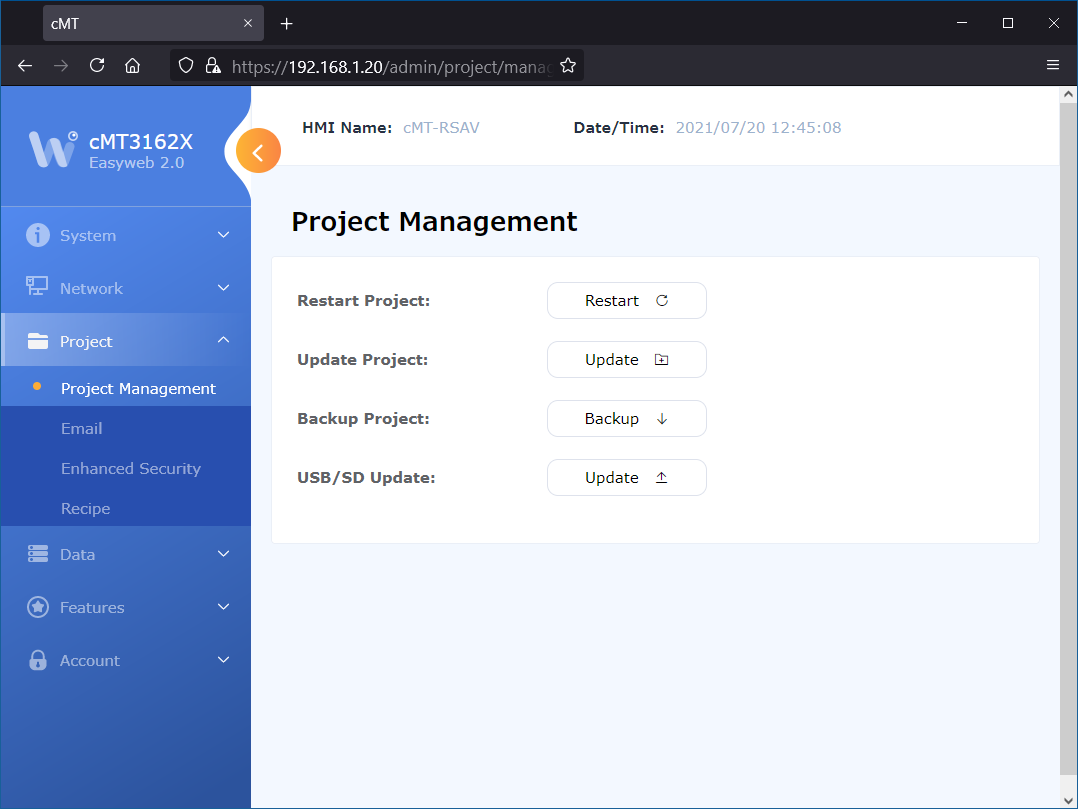 На этой странице пользователь может перезапустить/обновить/создать резервную копию файла проекта.