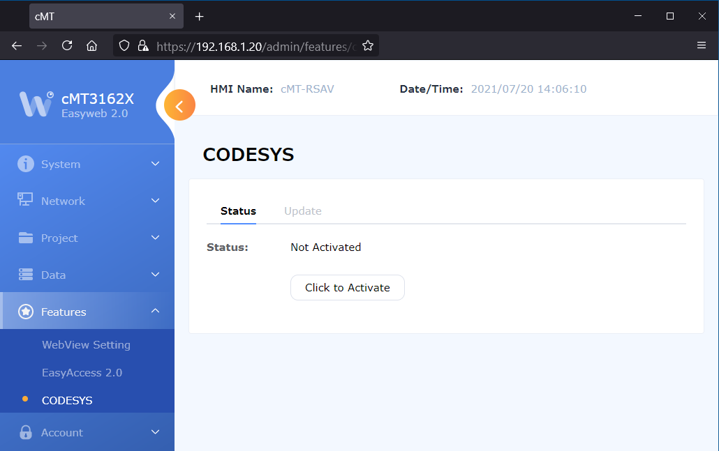 На этой странице пользователь может активировать CODESYS и управлять настройками обновлений прошивки.