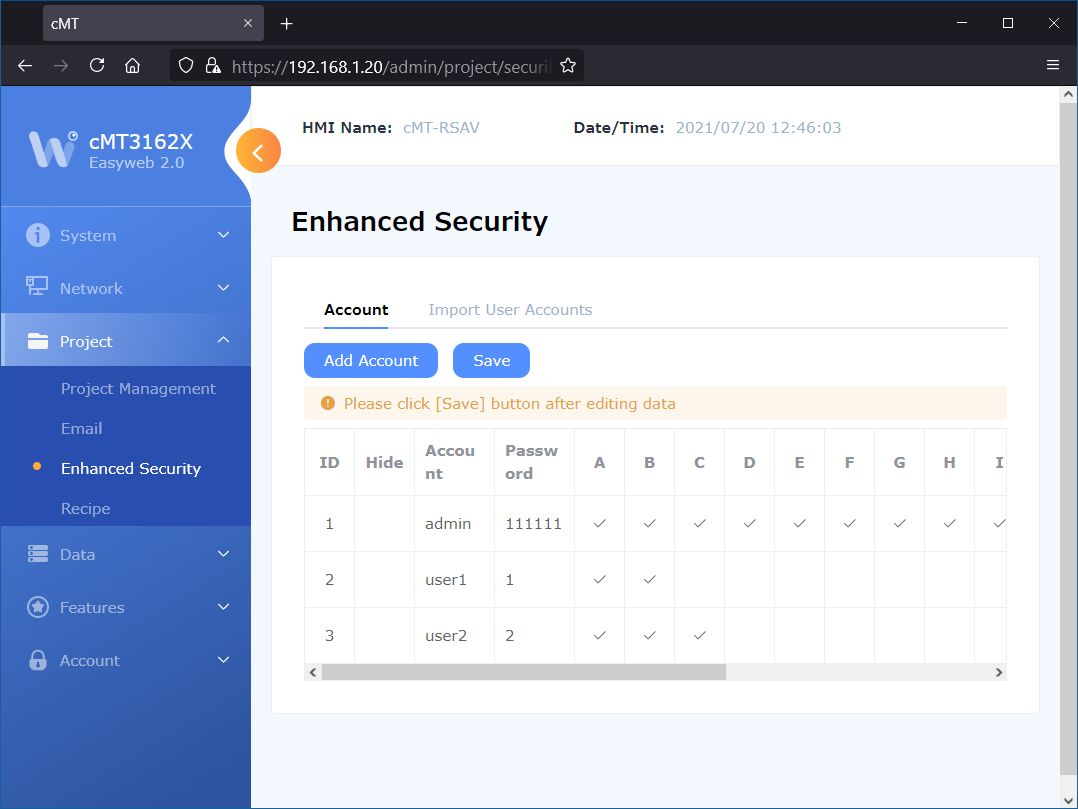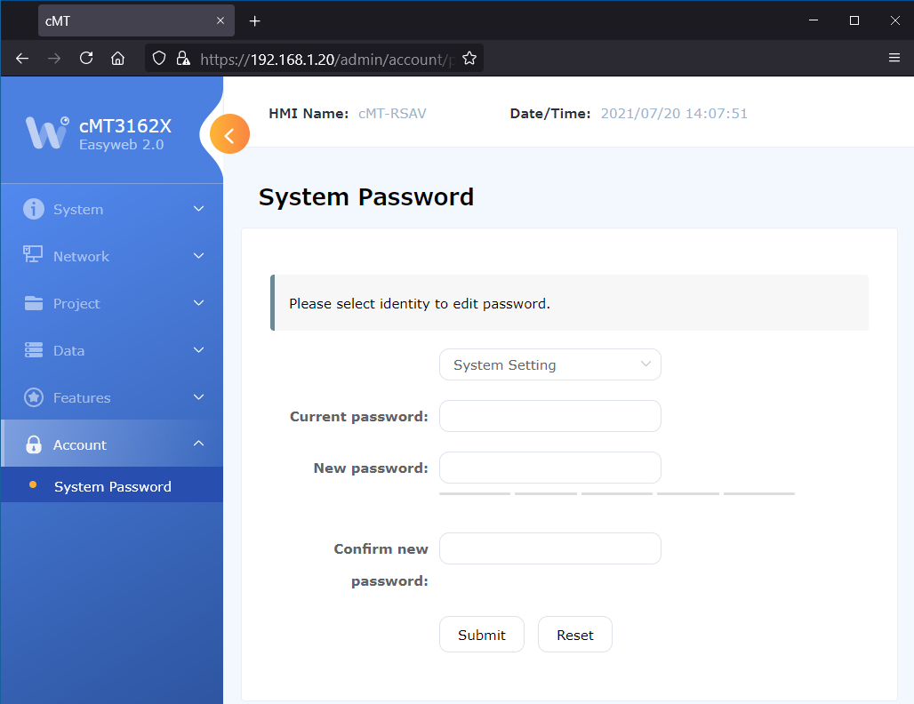 Существует четыре различных уровня защиты паролем: System Setting, Update Project, History, и User, и на этой странице пользователь может изменить пароли. Пароли по-умолчанию — 111111.