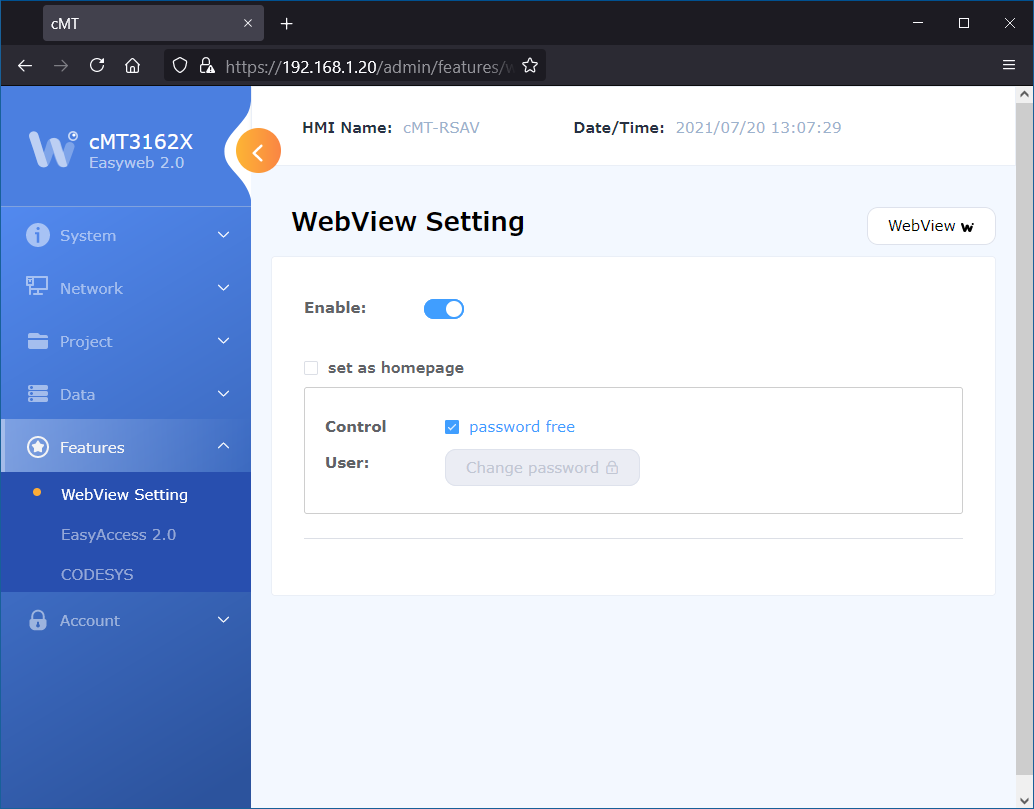 На этой странице пользователь может включить/отключить WebView и установить пароль. Пожалуйста, см. в этом руководстве пользователя для получения более подробной информации.