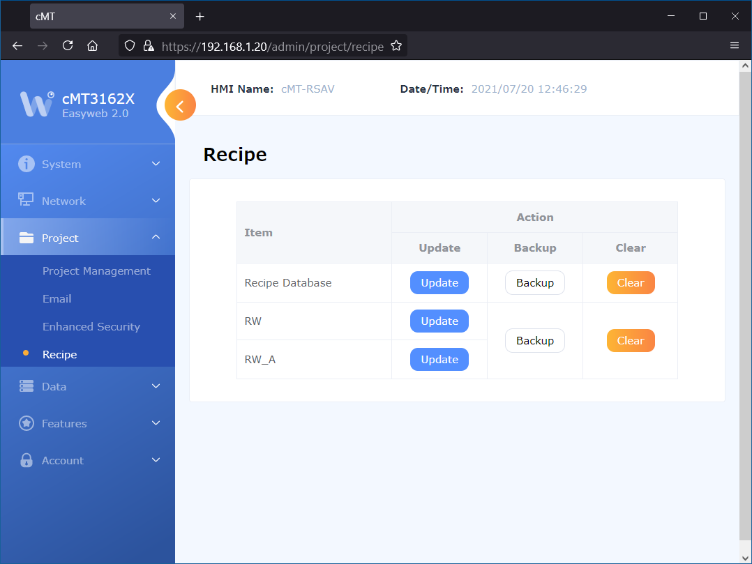 На этой странице пользователь может обновить/создать резервную копию или очистить данные рецептов на панели.
