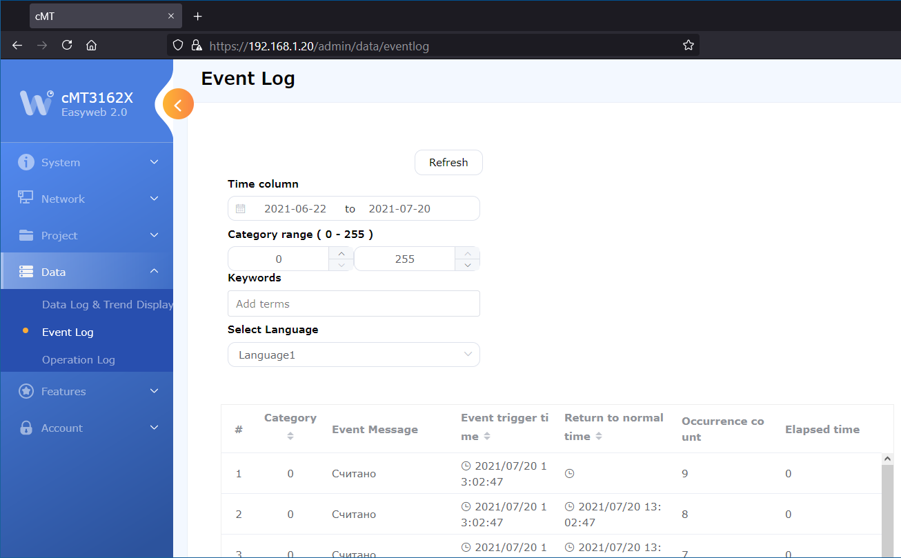 На этой странице отображается журнал данных и соответствующий тренд. Данные можно экспортировать или создать резервную копию.