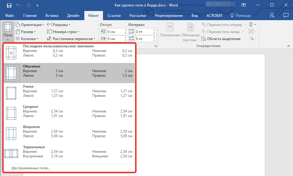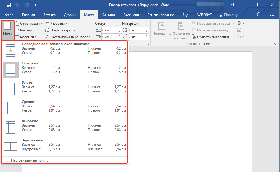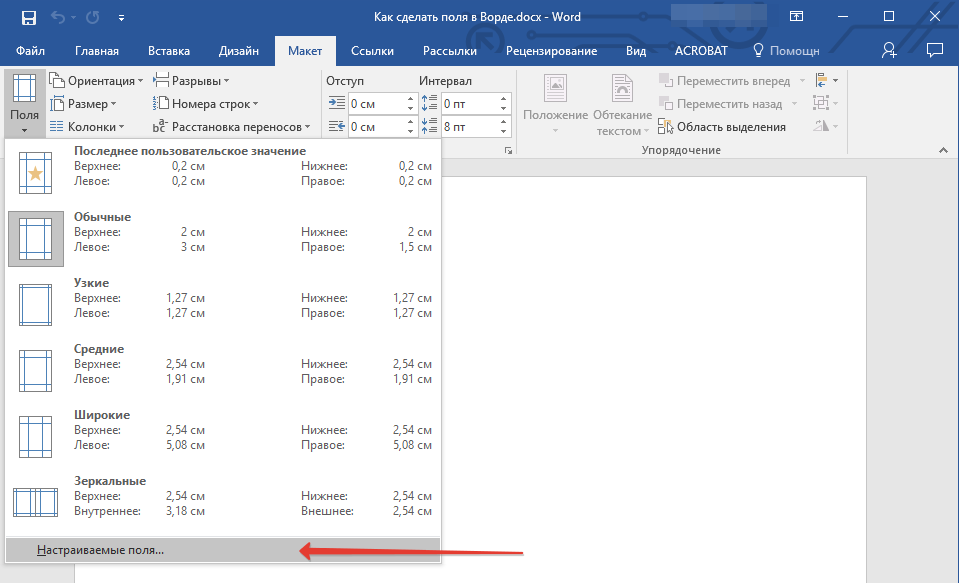 Если вы хотите изменить поля страницы по умолчанию, выберите наиболее подходящее из имеющихся, затем выберите последний элемент, Пользовательские поля, в меню кнопки «Поля”.