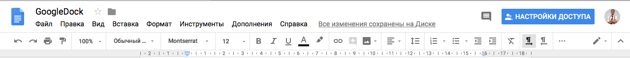 Интерфейс Google Docs не сильно отличается от интерфейсов других текстовых редакторов: