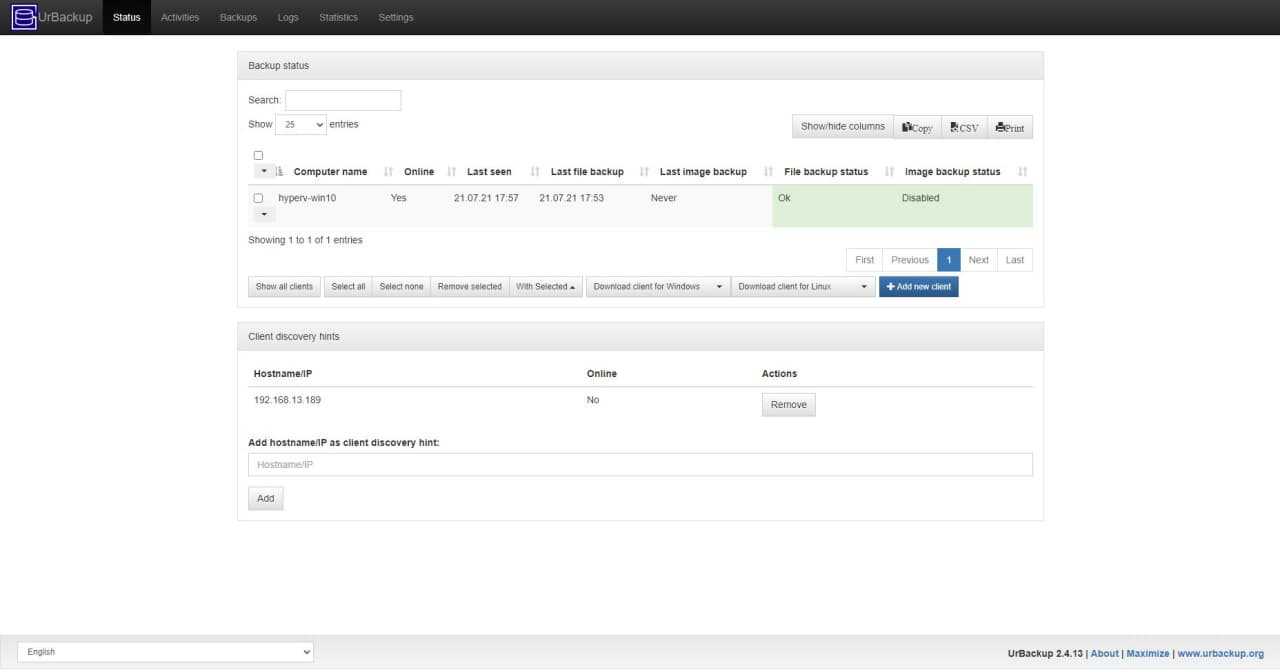 Я для теста сервер поднял в Docker на Centos 8, а забэкапил с помощью клиента Windows систему. UrBackup позволяет делать резервные копии как системы целиком, так и отдельных директорий и файлов.