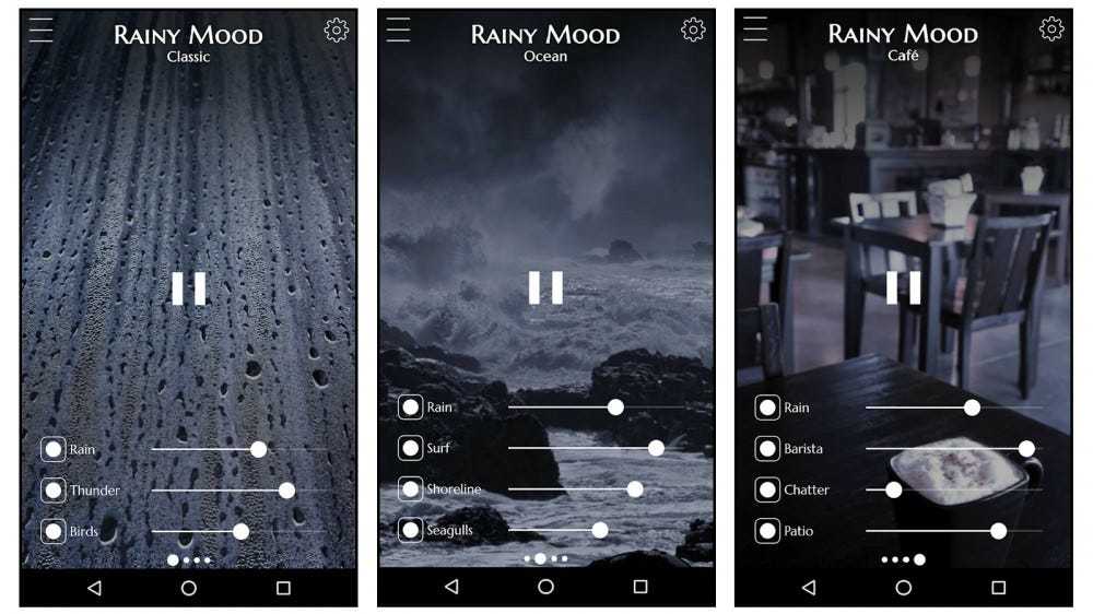 Вам не нужно жить в Сиэтле, чтобы наслаждаться прекрасными звуками дождя, благодаря Плохое настроение (2,99 $). Красивый чистый интерфейс Rainy Mood похож на дзен и прост в использовании. Существует бесплатная Lite-версия приложения, которую вы можете попробовать, которая предлагает звуковой ландшафт Classic Rainfall для прослушивания — смесь сильных дождей, грохочущего грома с регулярными раскатами грома и разреженных птичьих криков.
