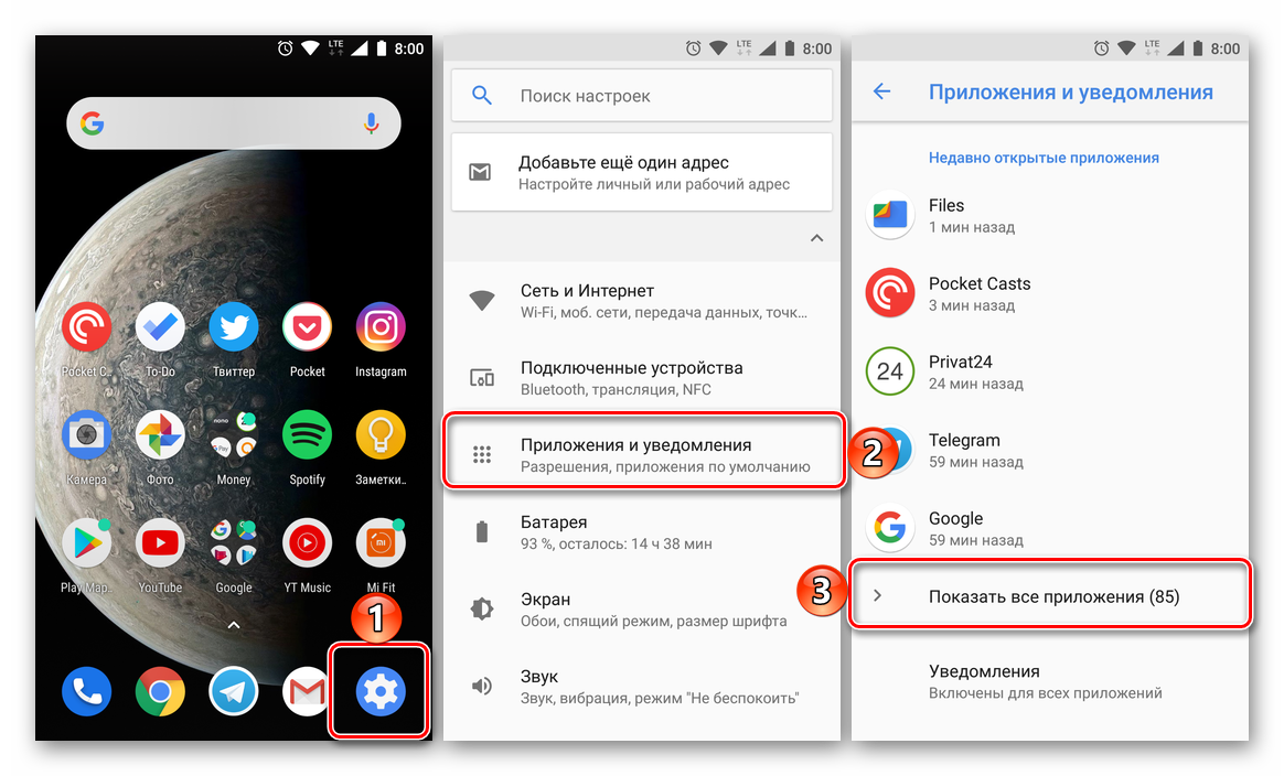 - Перейдите к «Настройкам» и откройте раздел «Приложения и уведомления», а из них перейдите к списку всех установленных приложений.