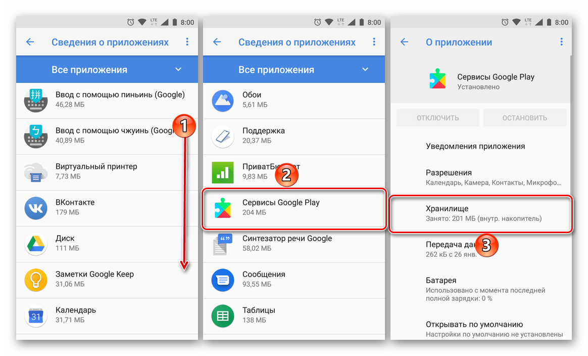Отыщите в нем Сервисы Google Play, нажмите по этому элементу для перехода на страницу общих сведений, где выберите пункт «Хранилище».