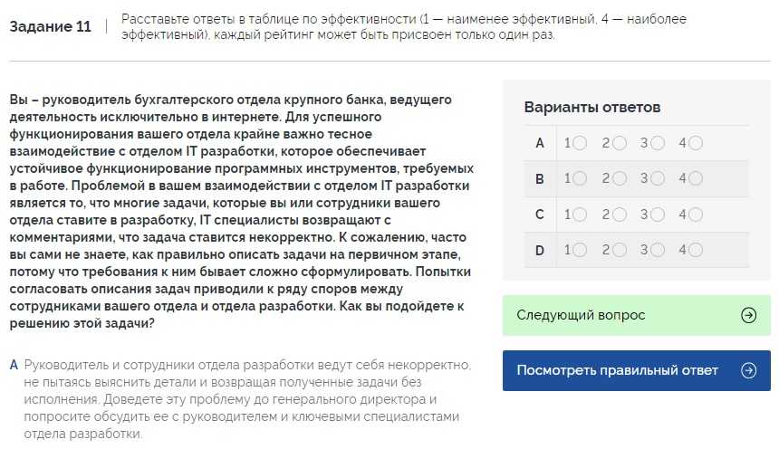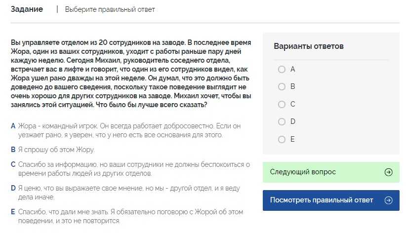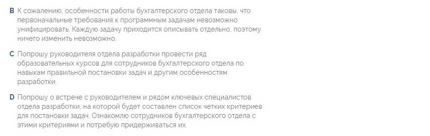 Рассмотрим еще один пример. Это более сложный и объемный ситуационный тест на критическое мышление. Как вы бы расставили ответы по их эффективности в этой ситуации?