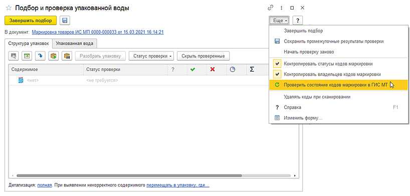 Отключить контроль статусов и контроль владельцев можно временно, на сеанс работы с формой Подбор и проверка маркируемой продукции в меню Еще указанной формы (рис. 2).
