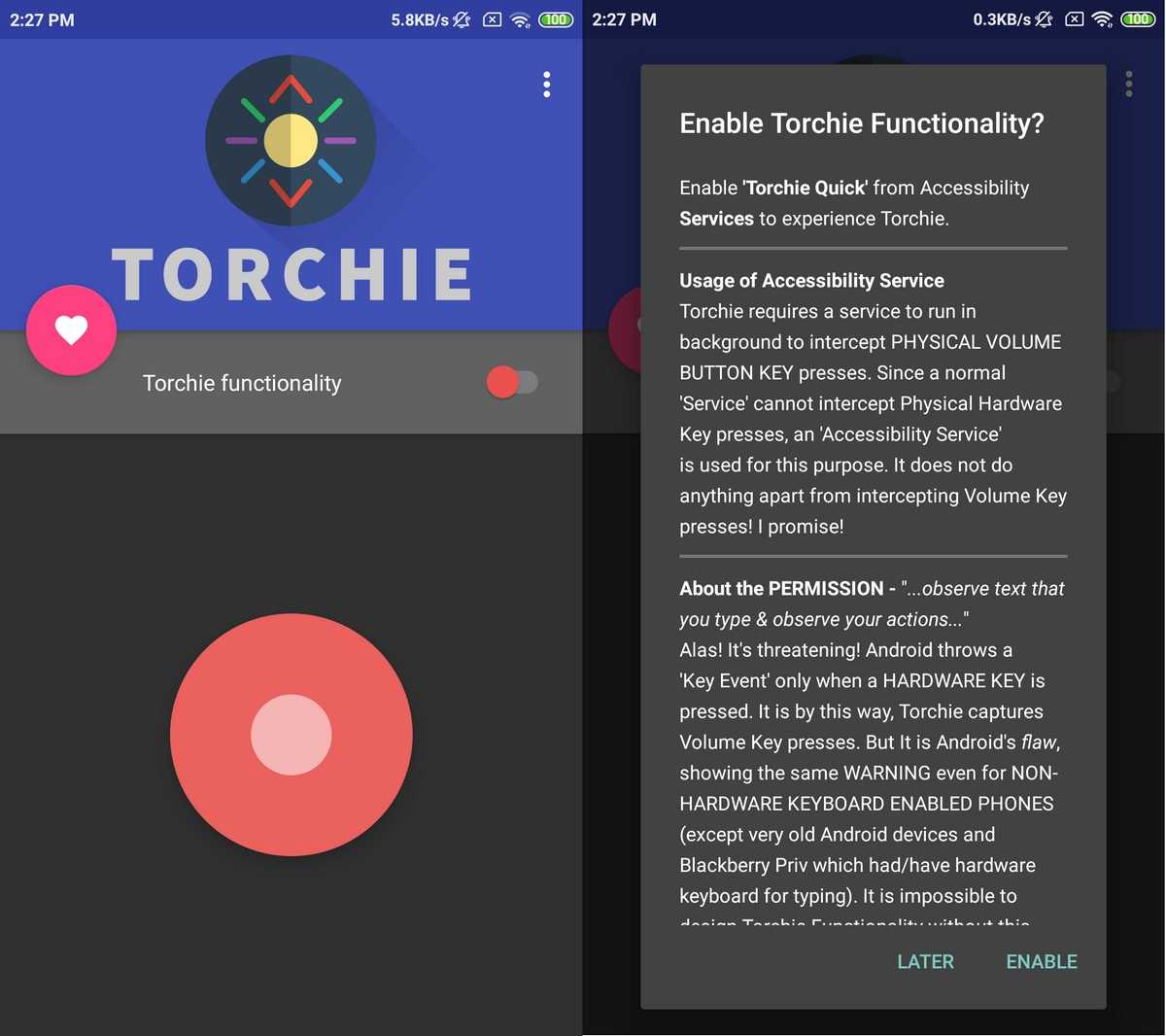 Если вам немного неудобно предоставлять ему права доступа, разработчик Torchie утверждает, что права доступа необходимы для того, чтобы приложение перехватывало нажатия аппаратных кнопок и что оно больше ничего не делает. Приложение также с открытым исходным кодом, так что вы можете взглянуть на его код, если вы хотите копнуть немного глубже.