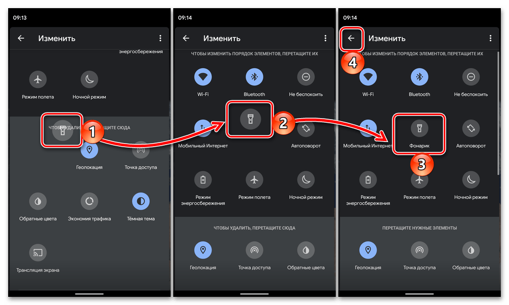 Зажмите соответствующую иконку и, не отпуская, поместите ее в удобное место шторки. Отпустите палец и нажмите на стрелку «Назад». Теперь фонарик всегда будет доступен в основной области ПУ.