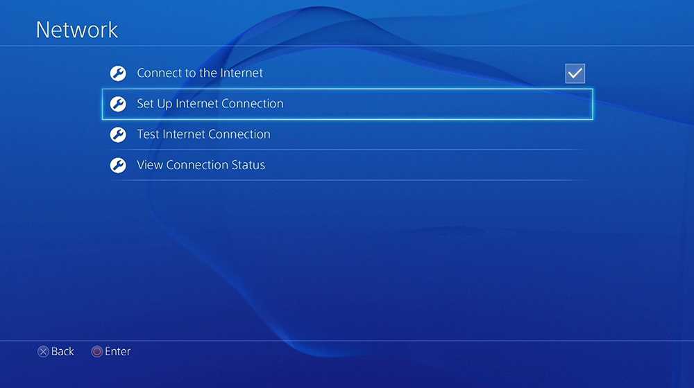 Для того чтобы подключить к беспроводной сети игровую консоль, для начала необходимо зайти в её настройки и нажать крестик. Дальше в открывшемся меню надо выбрать настройки сети Network и перейти в «Set Up Internet Connection» — «Настройки интернет-соединения».