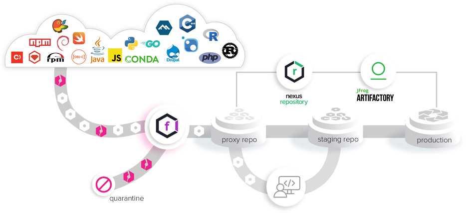 Модуль Nexus Firewall предотвращает ввод уязвимых компонентов в процесс разработки. Вы получаете инструмент автоматического контроля поступающих в вашу среду разработки внешних компонентов исходя из общих факторов риска – таких как уязвимости, возраст, популярность и лицензионные данные. С Nexus вы предотвратите разработку приложений, использующих нежелательные или неодобренные зависимости.