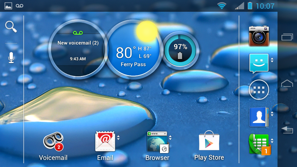 Более интересным, однако, является то, как Motorola и Sprint обрабатывают здесь домашние экраны. Вместо, скажем, семи домашних экранов, предварительно загруженных приложениями и виджетами, вы получаете один домашний экран. Вверху, прямо под статической панелью поиска Google, есть удобный виджет уведомлений, погоды и батареи. Кроме того, у вас есть ярлыки для голосовой почты, электронной почты, стандартного браузера, магазина Google Play, телефонной программы, приложения для людей, ящика приложений, текстовых сообщений и камеры.
