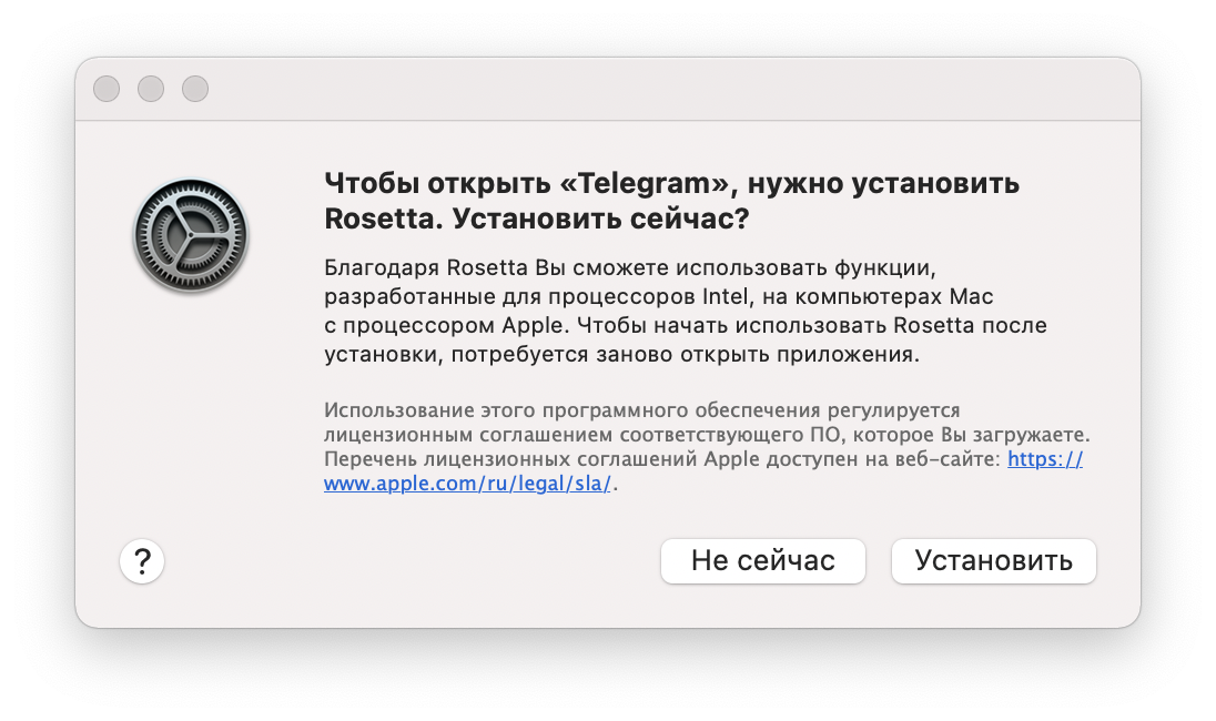 Но, скорее всего, вам придётся установить Rosetta 2 — это переводчик/эмулятор, который переводит код, написанный под x86, в ARM. Вот, например, у меня появилось такое окошко при установке Telegram: