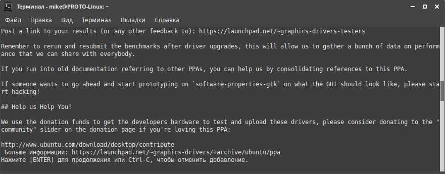 Первоочередным этапом установки является подключение источника PPA с графическими драйверами. В терминале выполним: