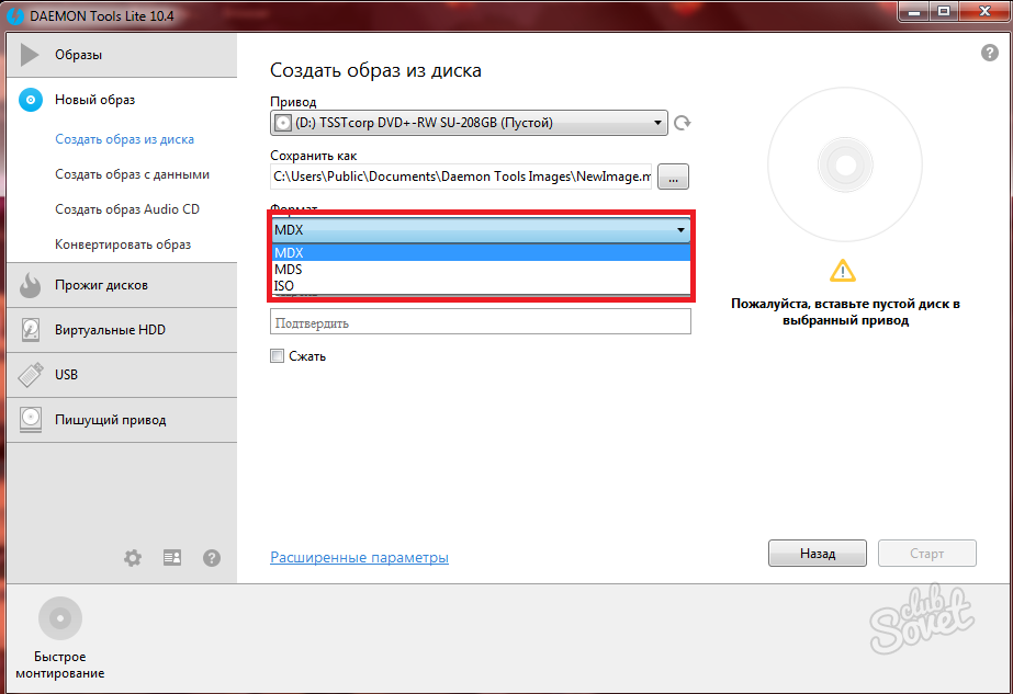 В поле «Формат» выберите желаемый формат будущего образа диска.