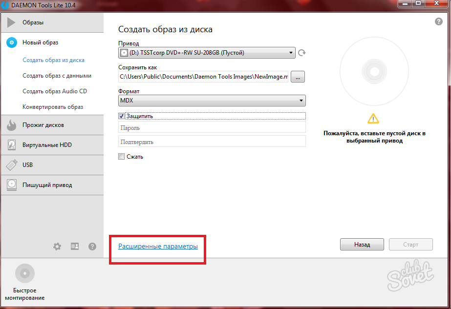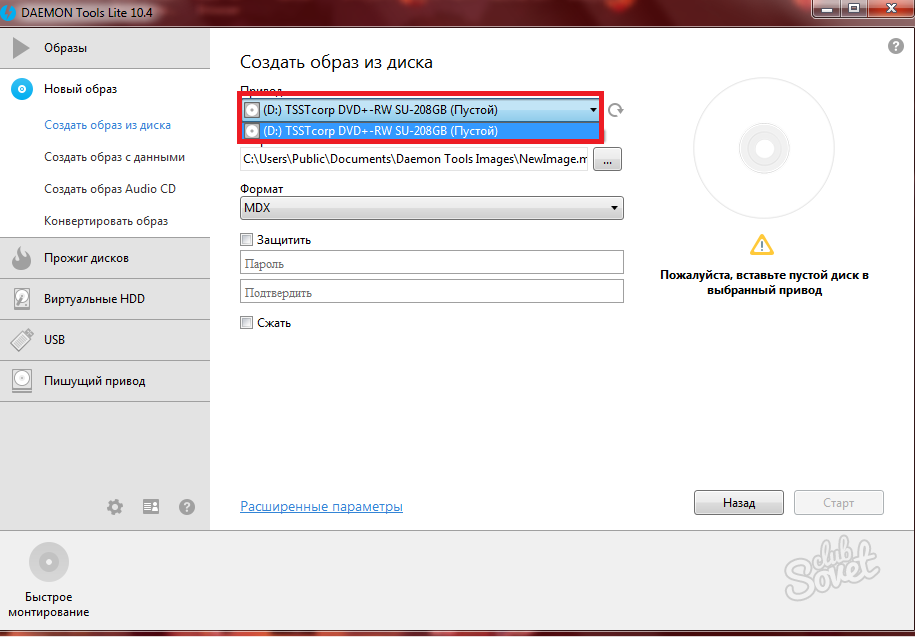 Настройка происходит достаточно быстро: вам нужно выбрать ваш оптический привод в поле «Привод». В нем уже должен быть вставлен диск с данными.