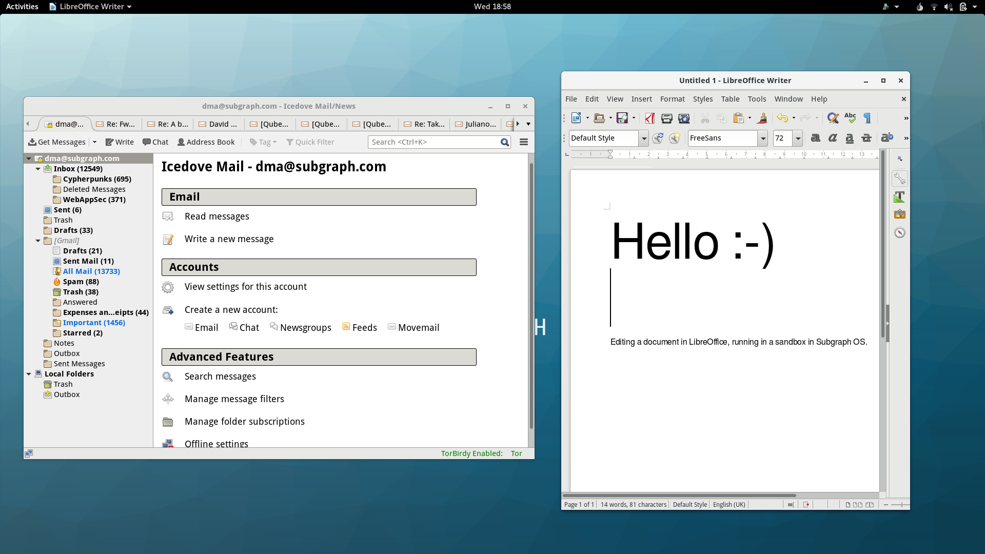 Основанная на Debian и сфокусированная на безопасности операционная система, нацеленная на более лёгкое отражения хакерских атак, даже на довольно слабых компьютерах. В SubgraphOS все опции приватности и безопасности настроены автоматически, избавляя пользователя от ручной настройки.